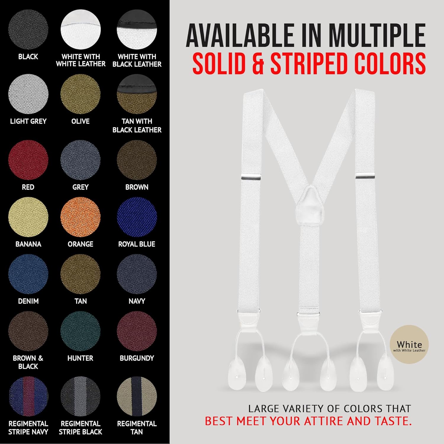 We have a full line of button suspenders with a large variety of color options. Choose among our regular-sized suspenders in 15 solid colors, 3 two-tone stripe colors, and 3 solid colors with black leather. We also have tall-sized suspenders in 14 solid colors, 3 two-tone stripe colors, and 2 solid colors with black leather trim.