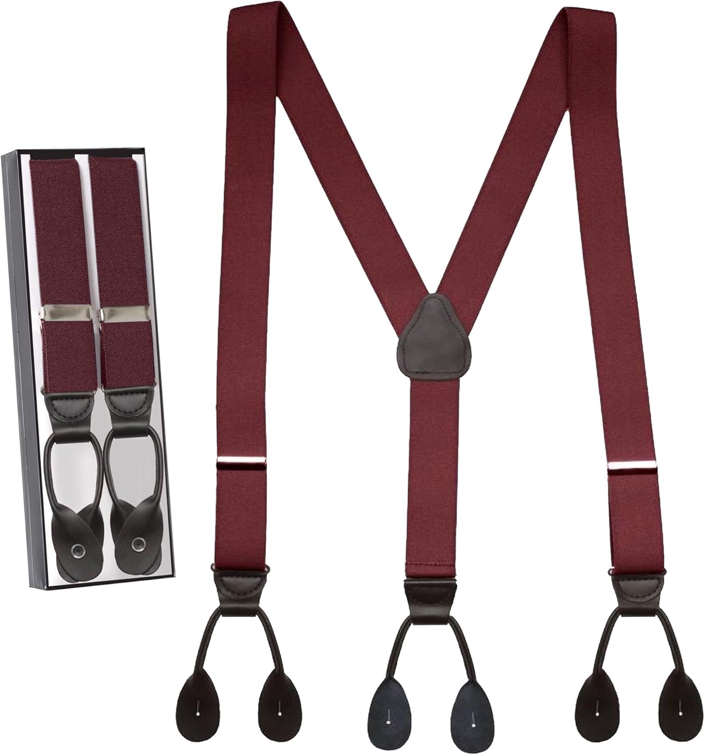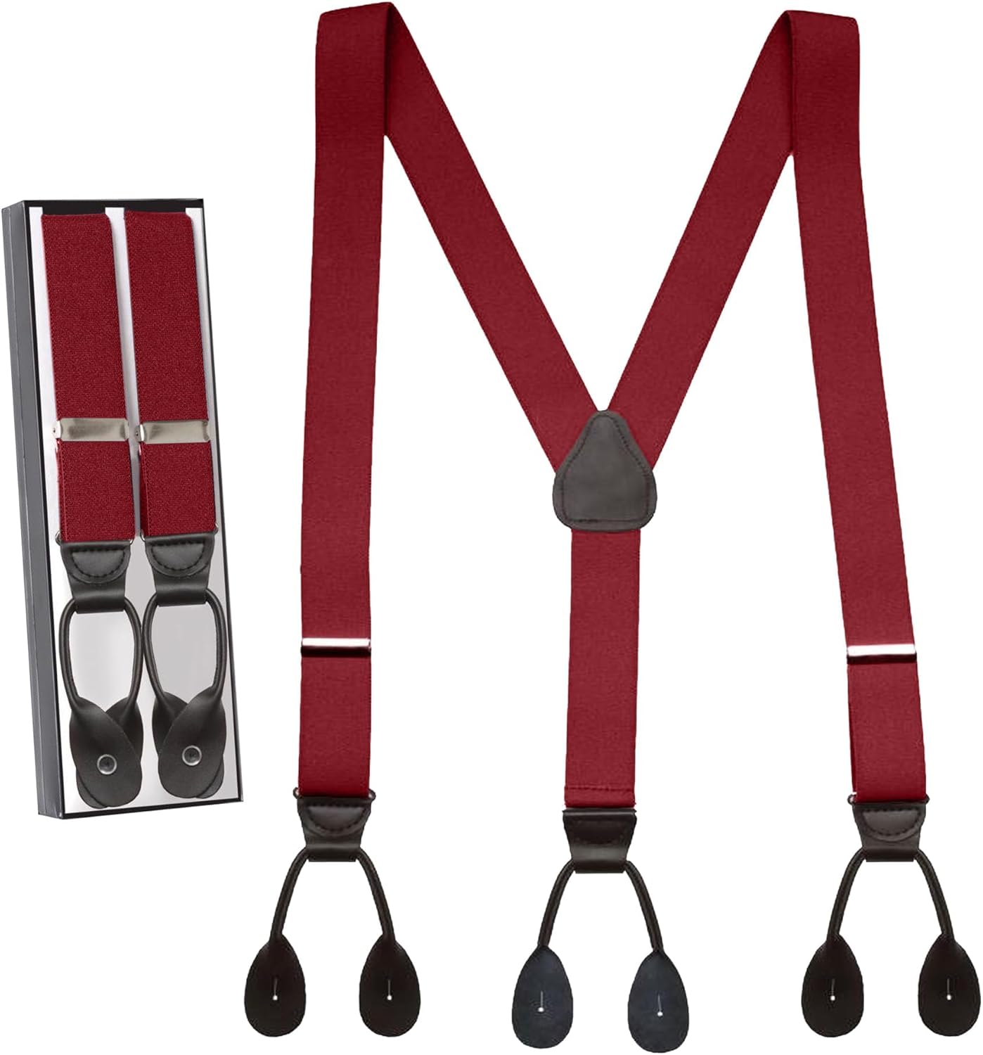 Each pair of suspenders is expertly crafted with pliable elastic to retain its shape and elasticity. It features a Y-back style with a leather crosspatch and button tabs that won’t rip or allow split seams.