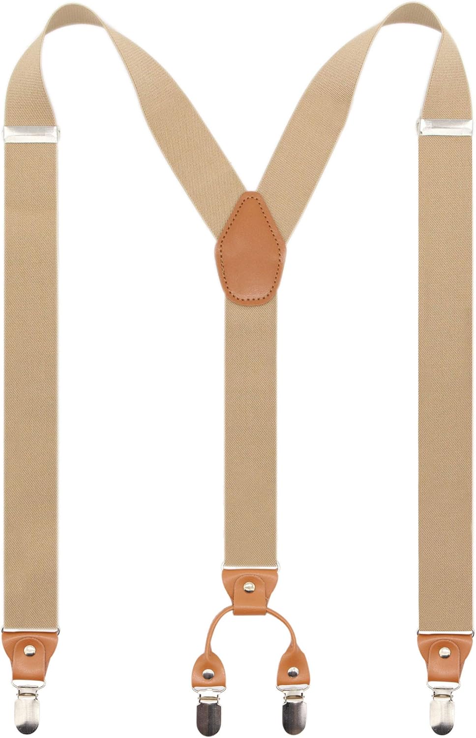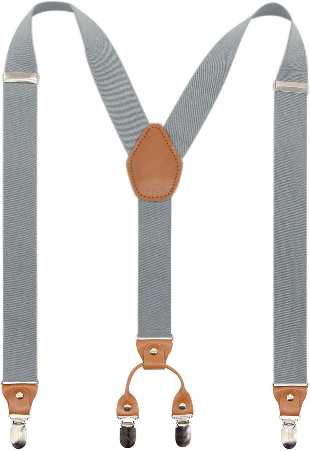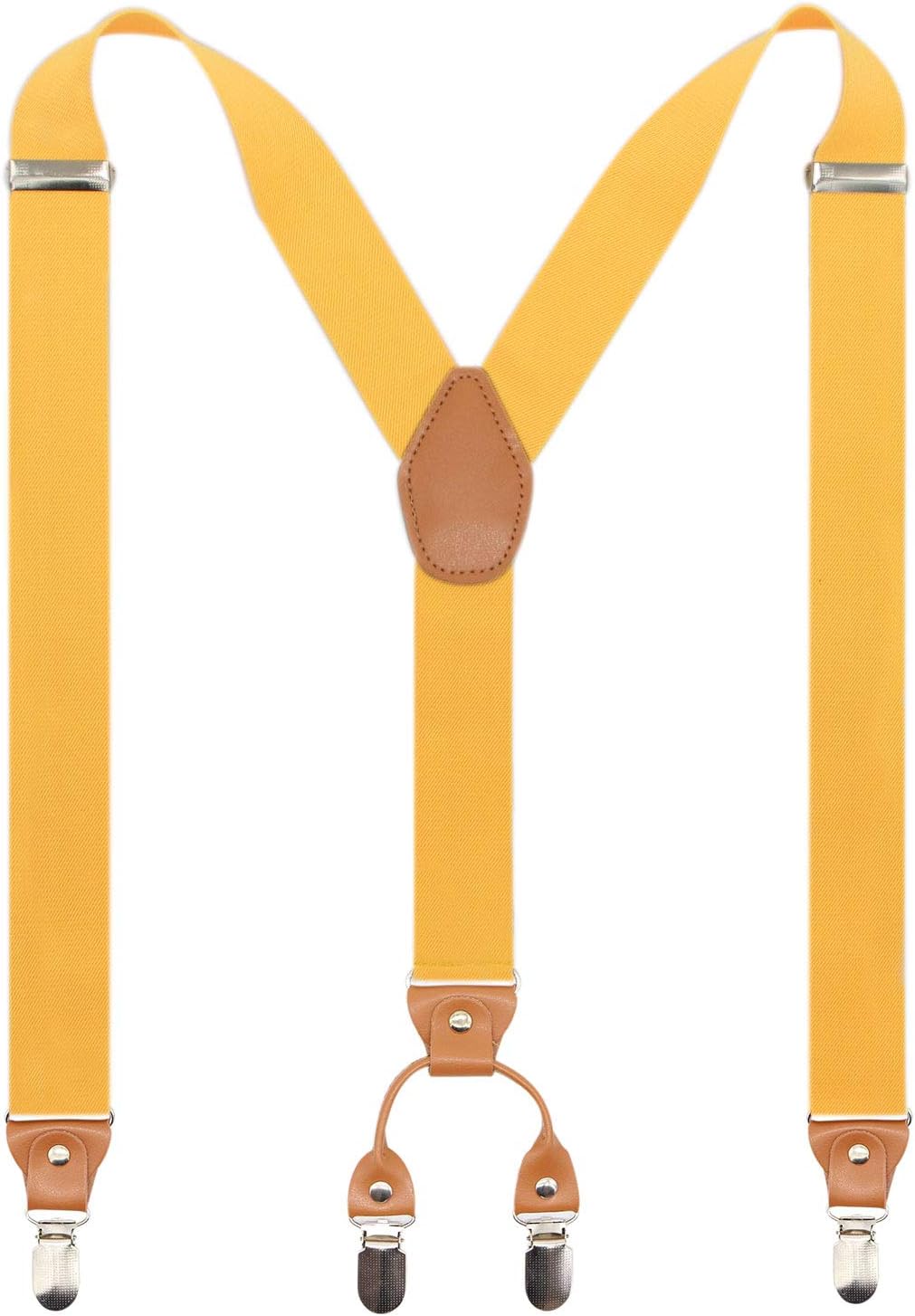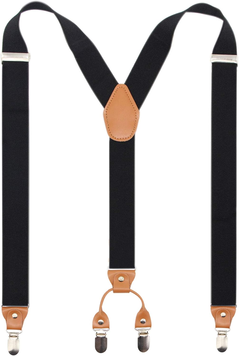 These suspebders are 1.38 inches wide with 4 strong metal clips,They adjust up to 52 inches length for most people,No matter he is young or big and tall or overweight.